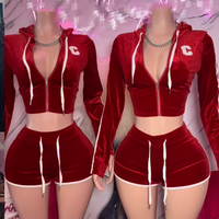 G01162Cベルベット2ピースセット女性用トラックスーツジップ刺繍レターフード付きジャケット + ショーツカジュアルスポーティストリートマッチングアウトフィット