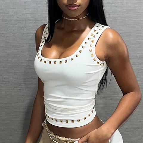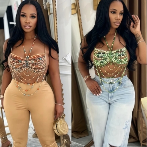 X22844CセクシービーズパッチワークキャミソールボディコンTシャツ女性スパゲッティストラップノースリーブバックレスクロップトップ女性ストリートウェア