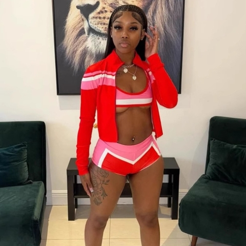 ชุดวอร์ม2ชิ้นสำหรับผู้หญิงชุดเสื้อแจ็กเก็ตแขนยาวพร้อมกางเกงขาสั้นสีตัดกันสำหรับ X20802C